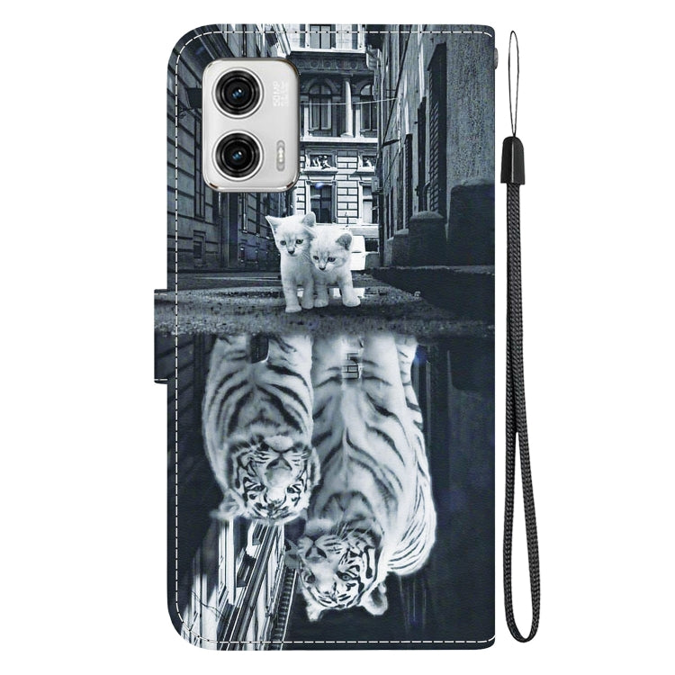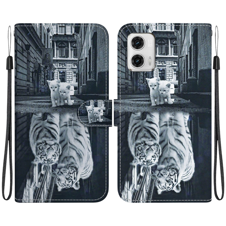 Funda de Cuero para Motorola Moto G73 con Dibujo Coloreado y Textura de Cristal (Reflejo de Tigre Gato)