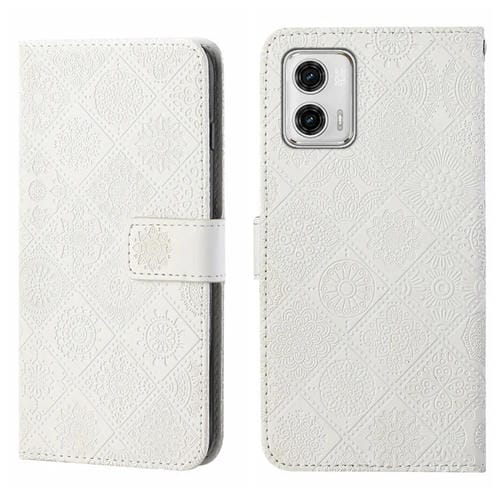 Funda de Cuero para Motorola Moto G73 con Patrón En Relieve Estilo Étnico (Blanco)