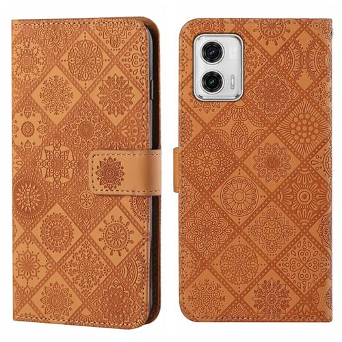 Funda de Cuero para Motorola Moto G73 con Patrón en Relieve de Estilo Étnico (Marrón)