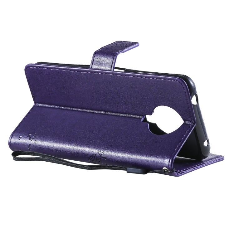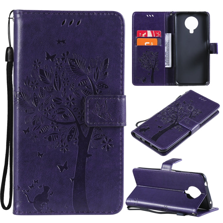 Para Nokia 6.3 Patrón de árbol y gato Impresión prensada Funda de cuero de la PU de la PU con el soporte y las ranuras y la cartera y el cordón (púrpura)