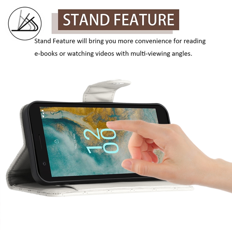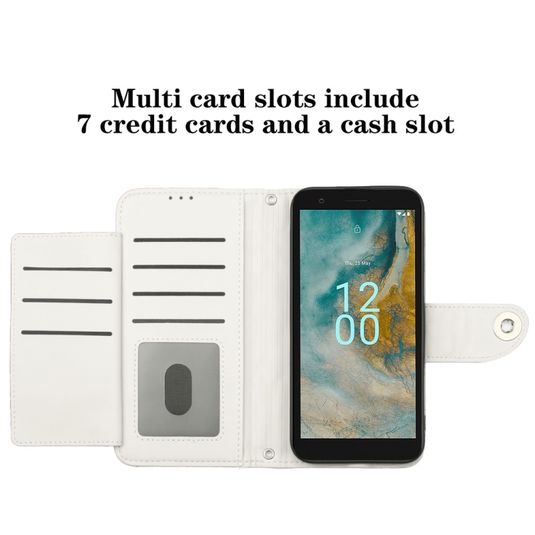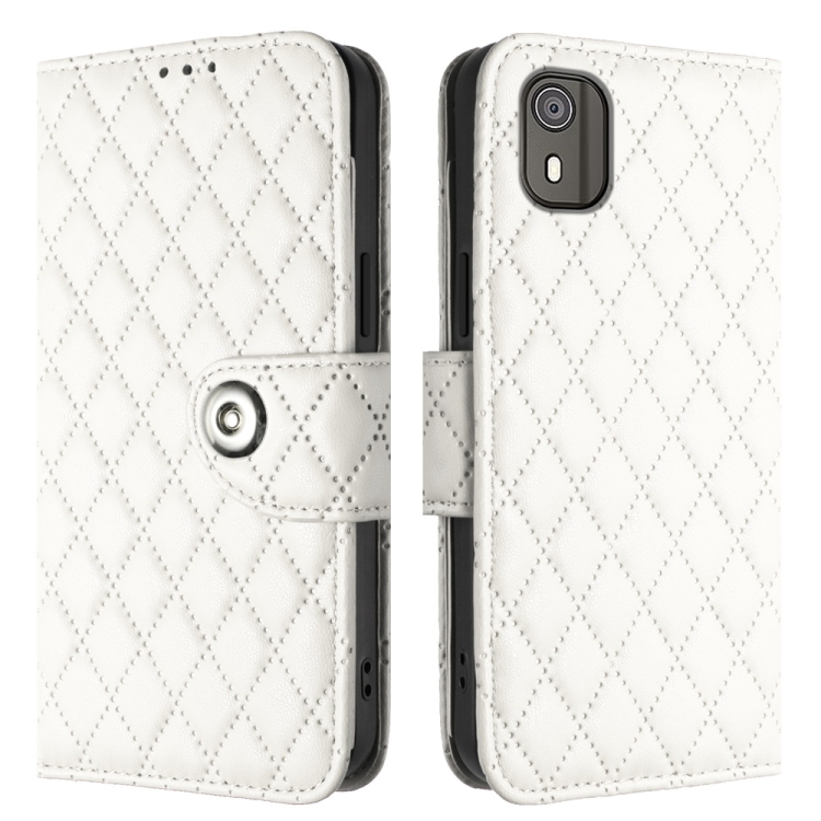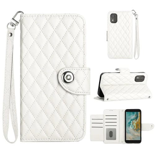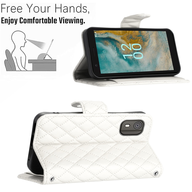 Funda de Cuero para Nokia C02 con Tapa, Textura Rómbica y Cordón (Blanco)