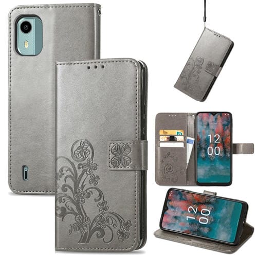 Estuche para Teléfono Nokia C12 de Cuero con Hebilla en Relieve y Cierre de Cuatro Hojas (Gris)