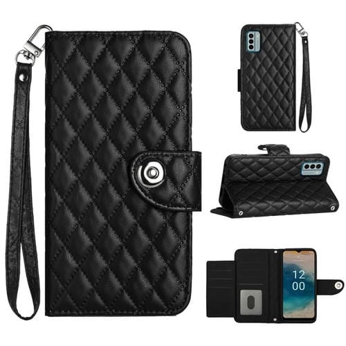 Funda de Cuero para Nokia G22 con Tapa, Textura Rómbica y Cordón (Negro)