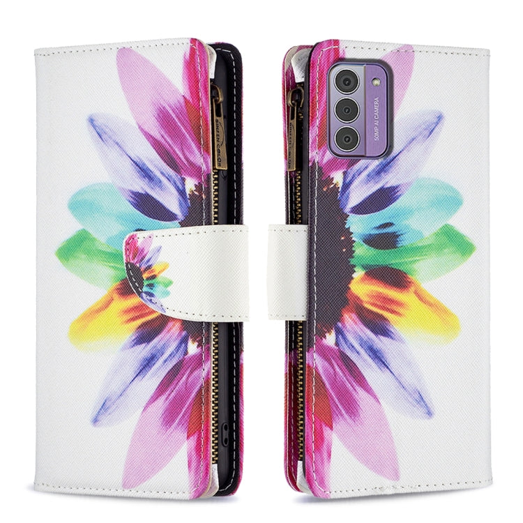 Estuche de Cuero con Cremallera para Nokia G42/G310 con Dibujo Coloreado (Flor del Sol)
