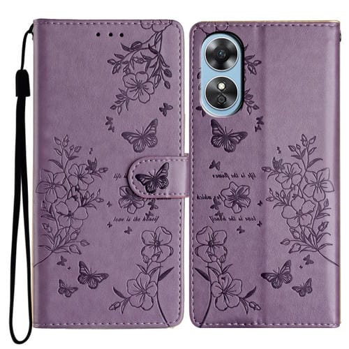 Para Oppo A17 Butterfly Love Flower Funda de Cuero para Teléfono En Relieve (Púrpura)