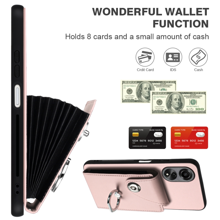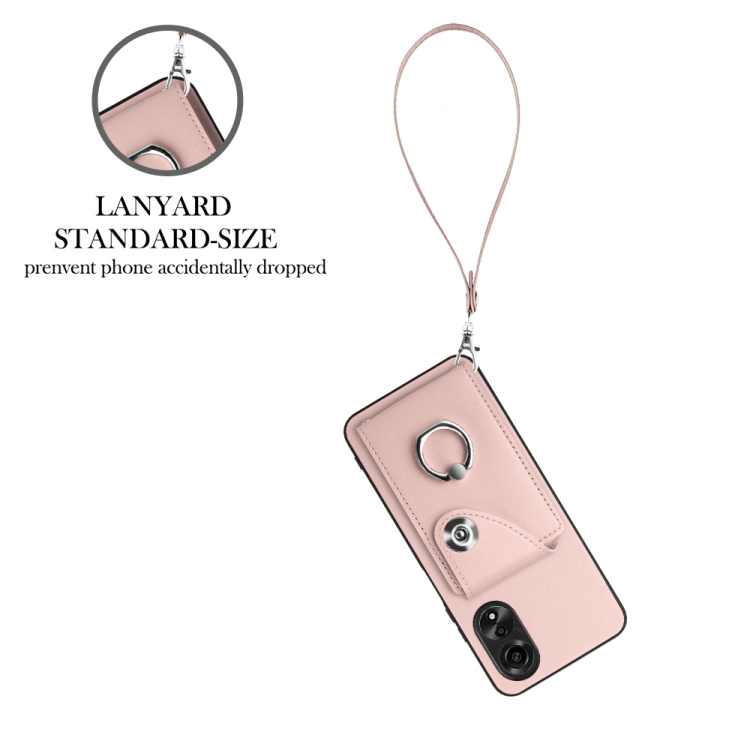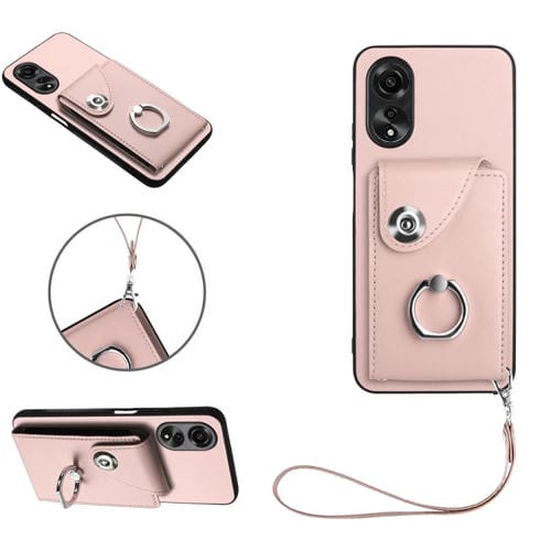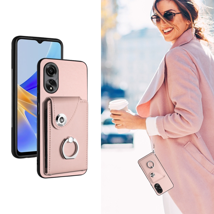 Para Oppo A58 4G Global Organ Card Bag Ring Holder Funda para Teléfono Pu con Cordón (Rosa)