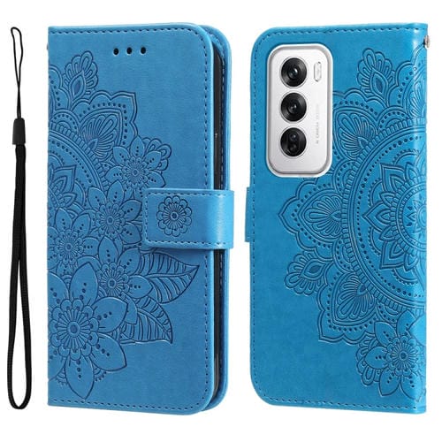 Para Oppo Reno12 5G Global Funda para Teléfono de Cuero con Estampado de Flores de Siete Pétalos (Azul)