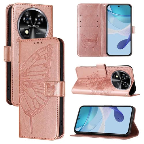 Funda de Cuero para Oukitel C37 con Mariposa en Relieve (Oro Rosa)
