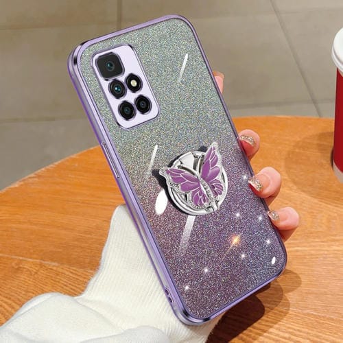 Para Redmi 10 Funda para Teléfono de TPU con Soporte de Mariposa con Brillo Degradado Plateado (Púrpura)