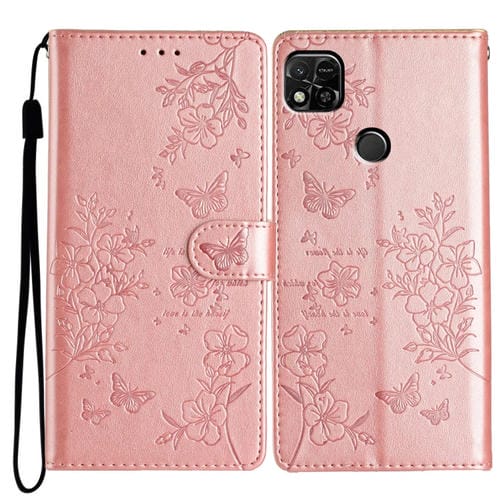 Para Redmi 10A Funda de Cuero para Teléfono con Mariposas y Flores (Oro Rosa)