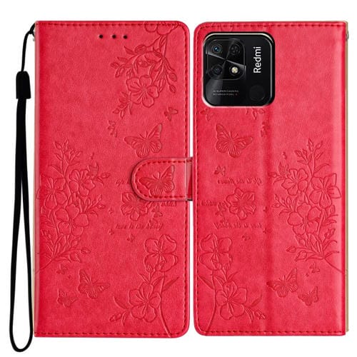 Para Redmi 10C Funda de Cuero para Teléfono con Mariposas y Flores (Rojo)