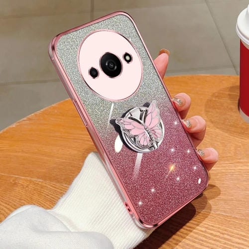 Para Redmi A3 Funda para Teléfono de TPU con Soporte de Mariposa con Brillo Degradado Plateado (Rosa)