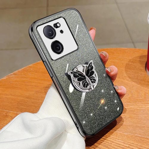 Para Redmi K60 Funda para Teléfono de TPU con Soporte de Mariposa con Brillo Degradado Ultra Plateado (Negro)
