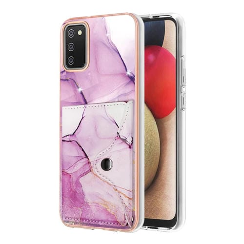 Estuche para teléfono Samsung Galaxy A02S Versión Estadounidense con ranura para tarjeta IMD patrón Mármol (Oro Rosa Púrpura)