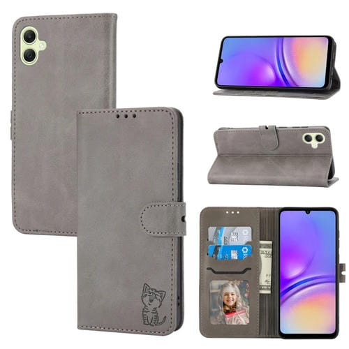 Funda para Teléfono Samsung Galaxy A05 Cuero con Tapa Patrón Gato Feliz (Gris)