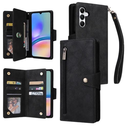 Funda de Cuero Samsung Galaxy A05S para Teléfono con Remache Hebilla y 9 Tarjetas con Tres Pliegues (Negro)