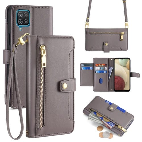 Funda para Samsung Galaxy A12 Lite Cuero con Billetera Cremallera Cuerpo Cruzado Textura Oveja (Gris)