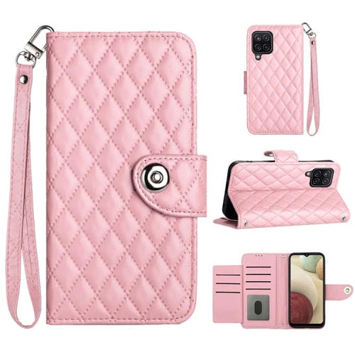 Funda para Teléfono Samsung Galaxy A12 M12 Cuero con Tapa Textura Rómbica y Cordón (Rosa)