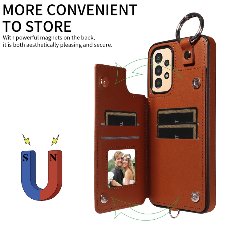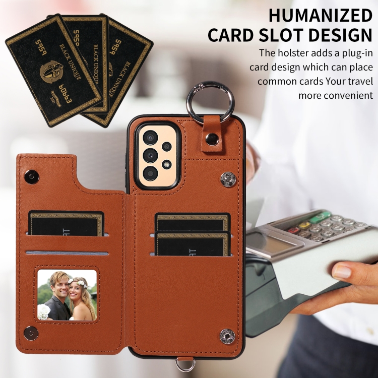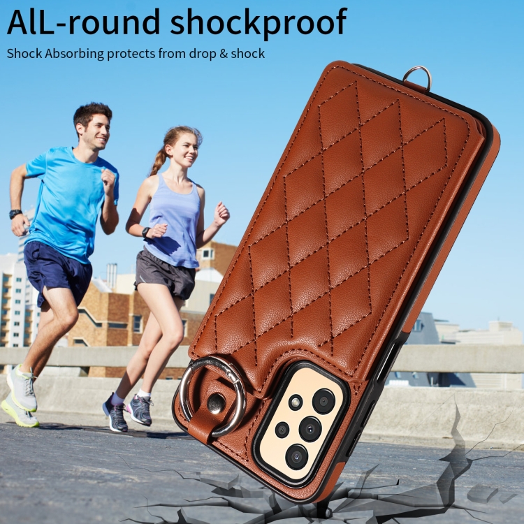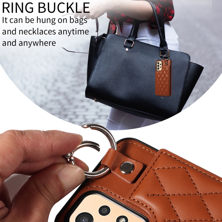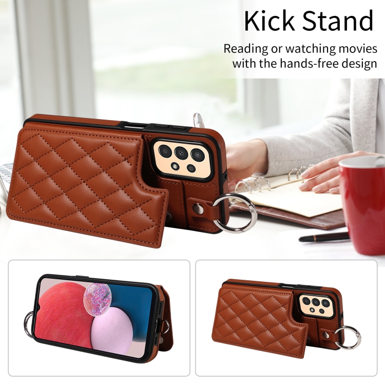 Estuche para teléfono Samsung Galaxy A13 4G y 5G con bolsa para tarjetas textura rómbica y cordón corto (Marrón)