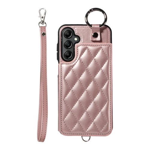 Estuche para Teléfono Samsung Galaxy A14 4G 5G con Bolsa para Tarjetas Textura Rómbica y Cordón Corto (Oro Rosa)