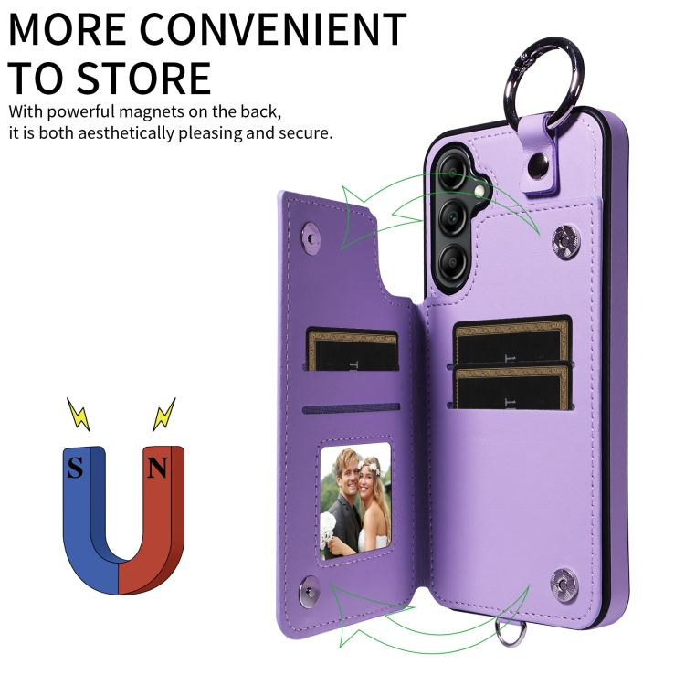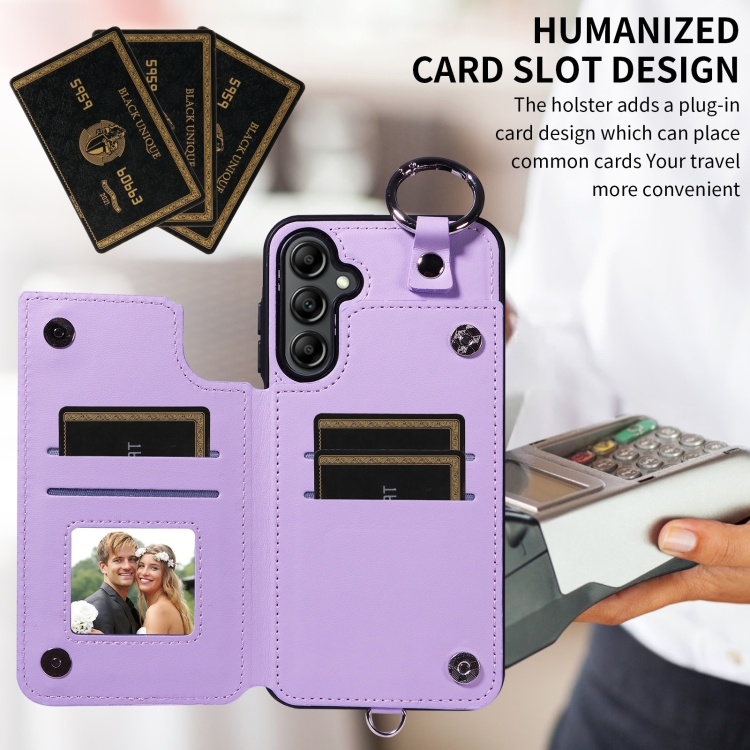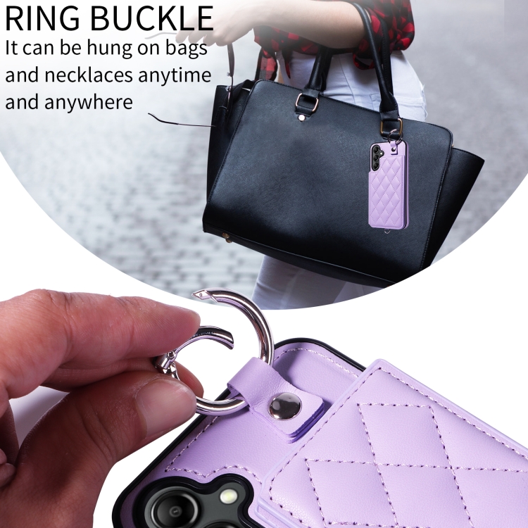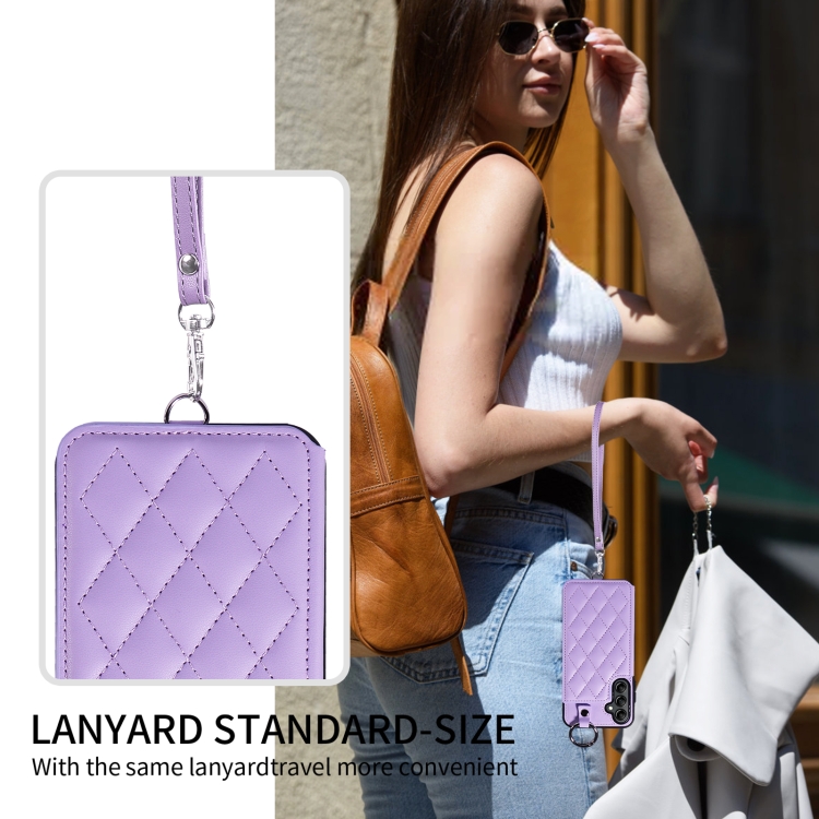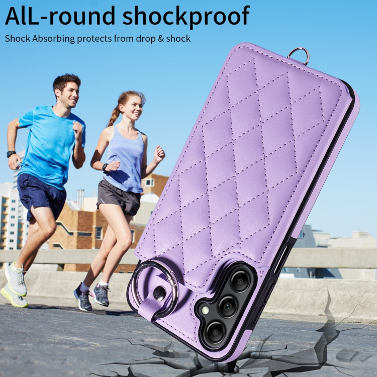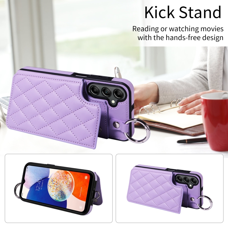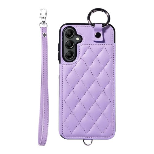 Estuche para teléfono Samsung Galaxy A14 4G 5G con bolsa para tarjetas textura rómbica y cordón corto (Púrpura)