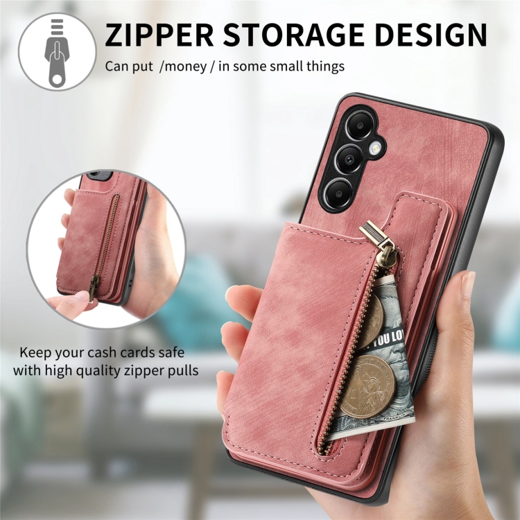 Estuche para teléfono Samsung Galaxy A14 4G y 5G con billetera y cremallera de cuero (Rosa)