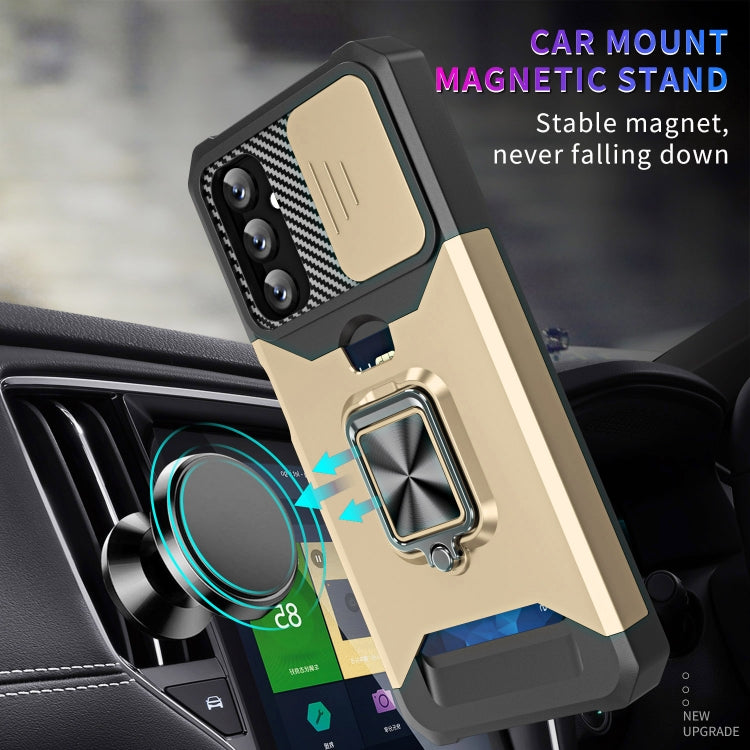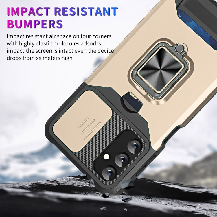 Estuche deslizante Samsung Galaxy A14 5G Camshield soporte anillo ranura tarjeta (Oro)