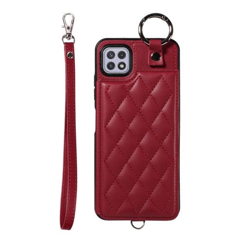 Estuche para Teléfono Samsung Galaxy A22 5G con Bolsa para Tarjetas Textura Rómbica y Cordón Corto (Rojo Vino)