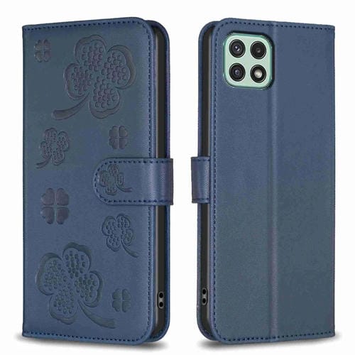 Funda de Cuero Samsung Galaxy A22 5G con Relieve de Cuatro Hojas (Azul)