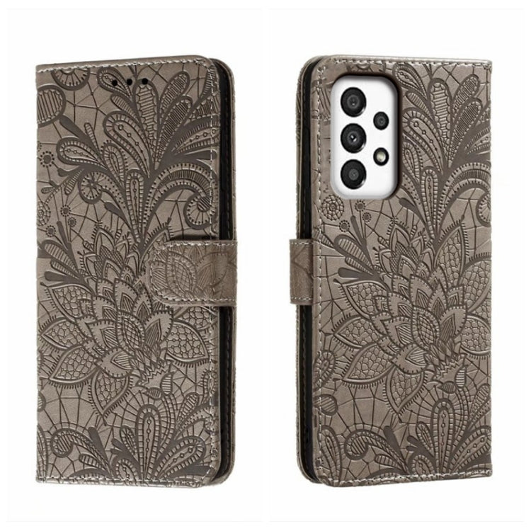 Para Samsung Galaxy A34 5G Flor de encaje en relieve Flip Funda de cuero para teléfono (Gris)