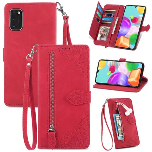 Funda para Samsung Galaxy A41 Cuero con Cremallera y Flores en Relieve (Rojo)