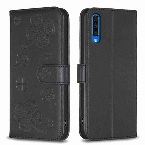 Funda de Cuero Samsung Galaxy A50 con Relieve de Cuatro Hojas (Negro)