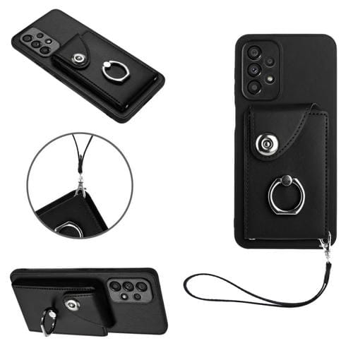 Funda para teléfono Samsung Galaxy A52 4G 5G de PU con soporte anillo y bolsa para tarjeta con cordón (Negro)