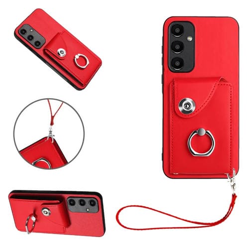 Funda para Teléfono Samsung Galaxy A55 de PU con Soporte para Anillo y Bolsa para Tarjeta con Cordón (Rojo)