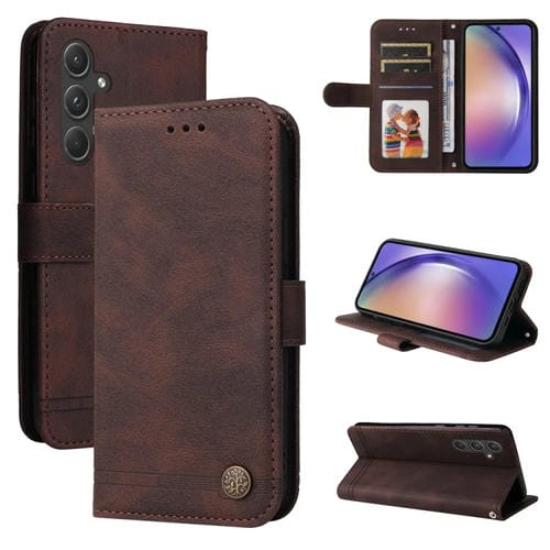 Funda de Cuero Skin Feel Life Tree para Samsung Galaxy A55 con Botón de Metal (Marrón)