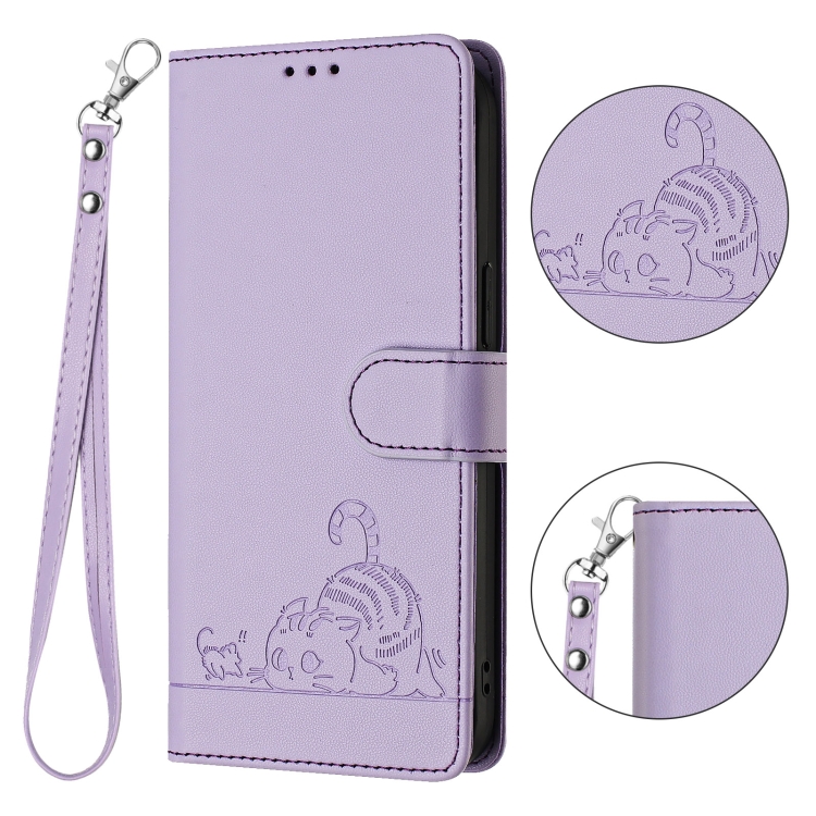 Estuche para Teléfono Samsung Galaxy A71 5G Cat Rat con Patrón en Relieve Rfid PU y Correa para Muñeca (Púrpura)