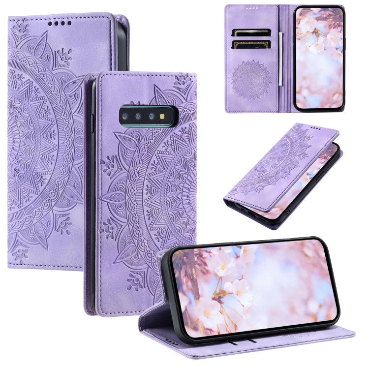 Estuche de Cuero Magnético Totem para Samsung Galaxy S10 en Relieve (Púrpura)