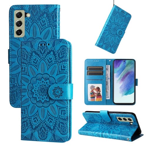 Estuche para teléfono Samsung Galaxy S21 FE 5G Cuero Estampado de Girasol en Relieve (Azul)