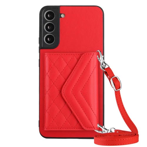 Estuche para teléfono Samsung Galaxy S22 + 5G con función Rfid, bolsa para tarjetas, textura rómbica y cordón largo (Rojo)