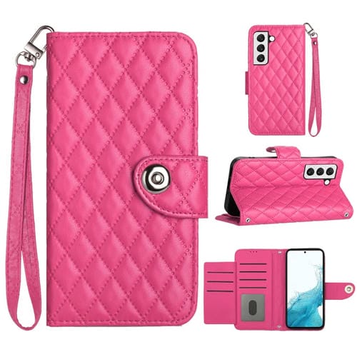 Funda para Teléfono Samsung Galaxy S22 + 5G Tapa de Cuero Textura Rómbica Cordón (Rojo Rosa)