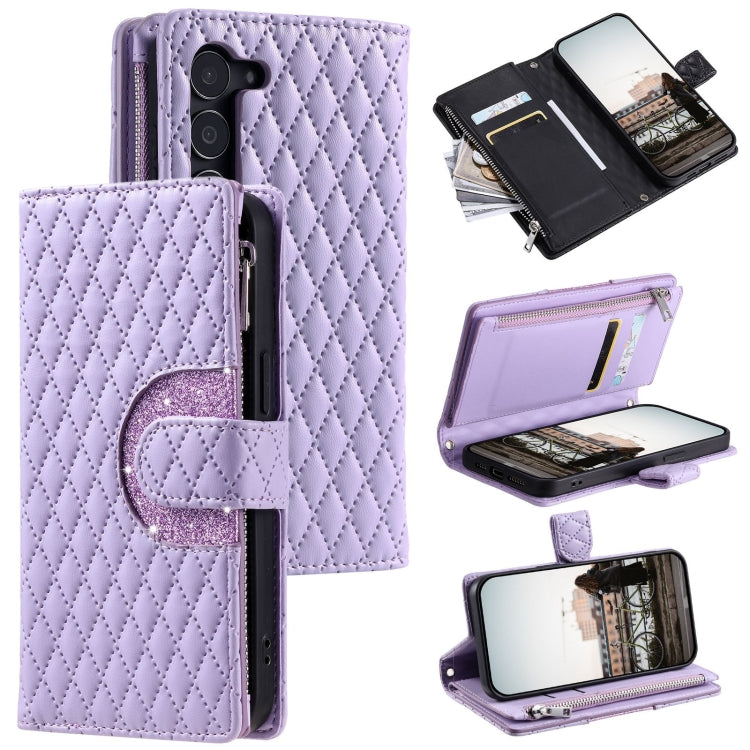 Estuche de Cuero Samsung Galaxy S23 + 5G con Billetera, Cremallera y Celosía Purpurina (Púrpura)