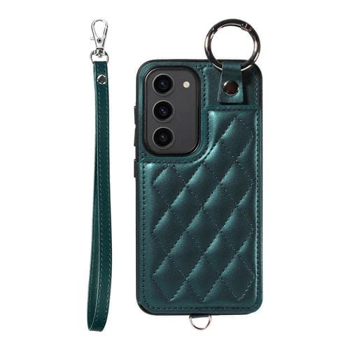 Estuche para Teléfono Samsung Galaxy S23 5G con Bolsa para Tarjetas Textura Rómbica y Cordón Corto (Verde)