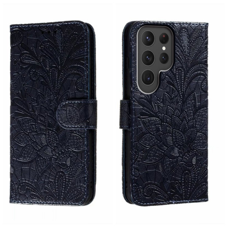 Para Samsung Galaxy S23 Ultra 5G Lace Flower Relieve Flip Funda de cuero para teléfono (Azul oscuro)