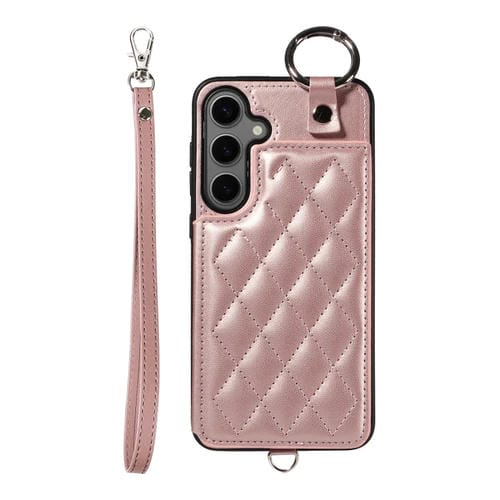 Estuche para teléfono Samsung Galaxy S24 + 5G con bolsa para tarjetas textura rómbica y cordón corto (Oro Rosa)