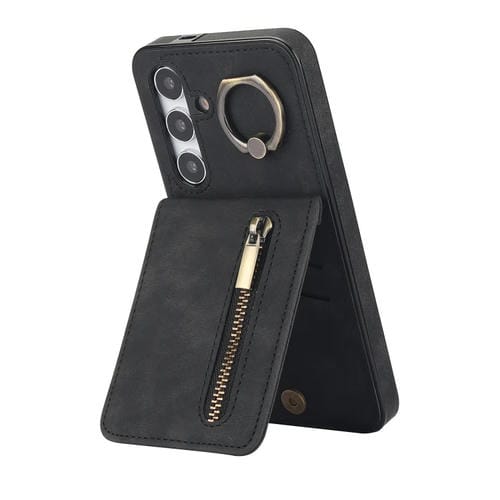 Estuche para teléfono Samsung Galaxy S24 5G con Ranura para Tarjeta RFID Anillo Retro y Cremallera (Negro)