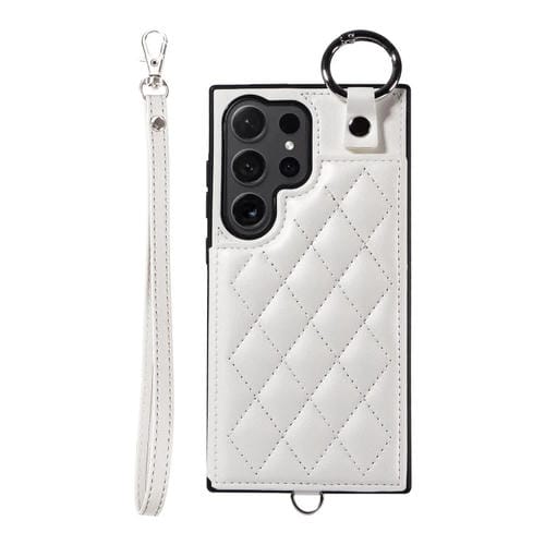 Estuche para Teléfono Samsung Galaxy S24 Ultra 5G con Bolsa para Tarjetas Textura Rómbica y Cordón Corto (Blanco)