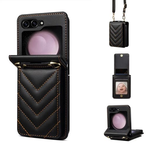 Estuche para Teléfono Samsung Galaxy Z Flip5 Cuero Plegable Rómbico con Cordón Largo (Negro)