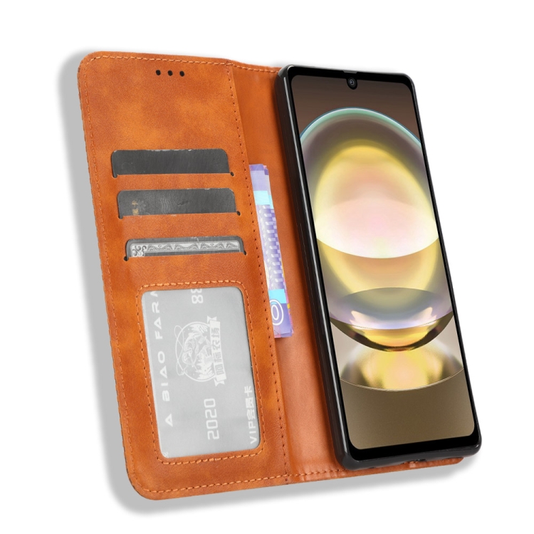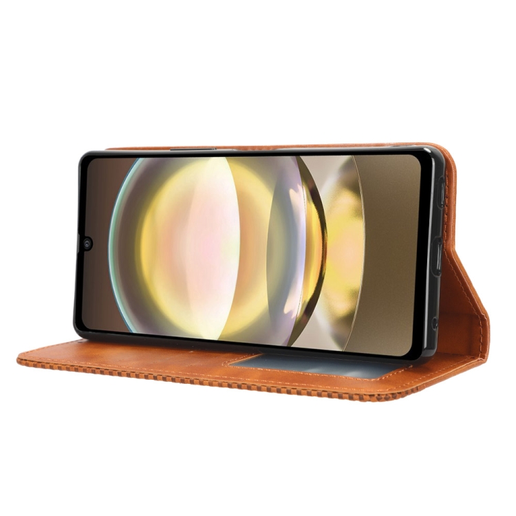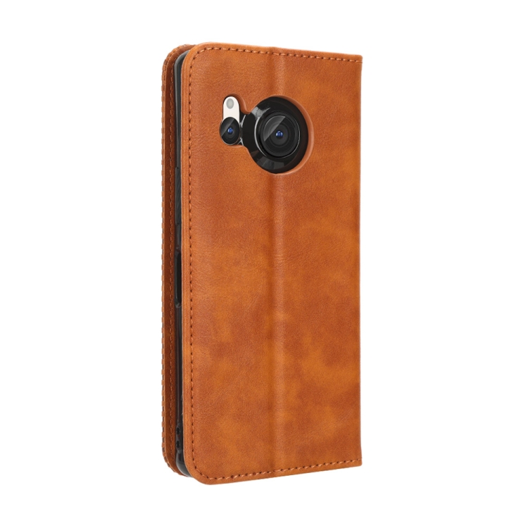 Funda de Cuero para Sharp Aquos R8 con Hebilla Magnética y Textura Retro (Marrón)