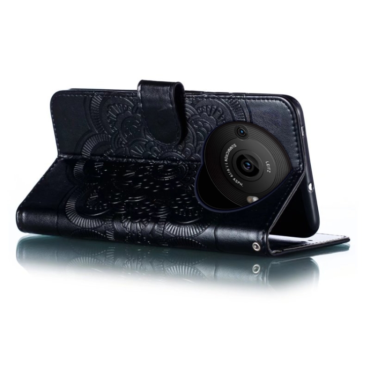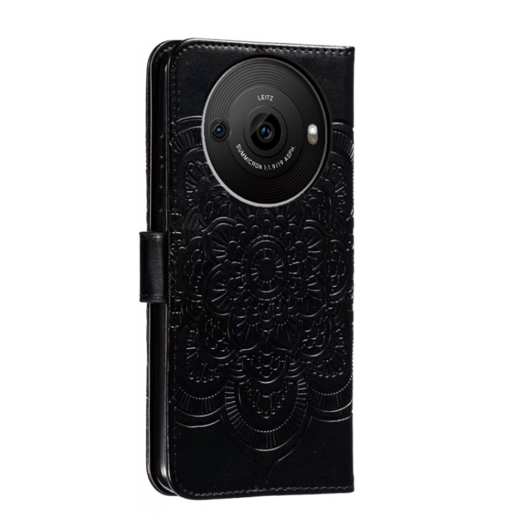 Funda de Cuero para Sharp Aquos R8 Pro con Patrón Sun Mandala en Relieve (Negro)