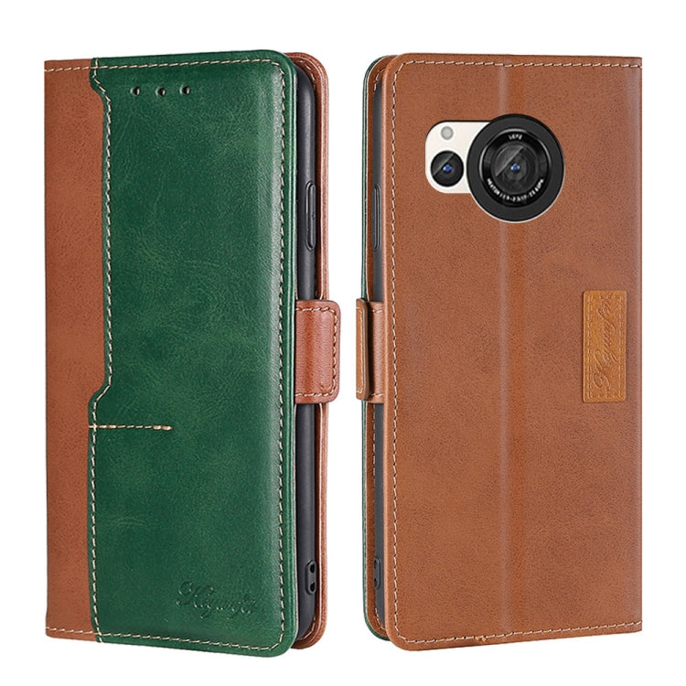 Funda de Cuero para Sharp Aquos R8 Sh-52D con Hebilla Lateral y Contraste (Marrón Oscuro + Dorado)